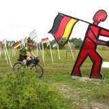 Es gibt bessere Orte, um der Trennung der Deutschen nachzuspüren, es gibt aber kaum Orte, die auf so wenig Raum so viele (un)passende Fotomotive bieten. Ich zische ein Cola im Restaurant, drücke drei Mal auf den Auslöser meiner Kamera und dann wieder zackig in die Pedale, denn ich möchte schnell im Ziel sein … noch könnte ich es unter sieben Tagen schaffen. So rauscht die Landschaft an mir vorbei und bei Mittelhammer verschwinde ich einer feuchten Senke zwischen den seichten Hügeln. Das Wasser der südlichen Regnitz zieht Millionen Mücken an. Seit die Grenzer hier nicht mehr permanent patrouillieren, haben die Insekten mächtig Durst und bitten mich am Schild „Staatsgrenze“ zum Aderlass.