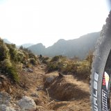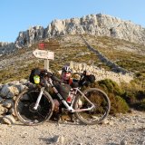 Ein wichtiger Punkt für den Spaß und Erfolg einer solchen Tour ist die Ausrüstung. Allem voran das Rad. Meine Wahl fiel auf das Carbon-Hardtail Greed SL von Haibike in der 29-Zoll-Version: Leicht, steif und dennoch hart im Nehmen, ohne unkomfortabel zu sein, so fällt mein Fazit nach 580 Kilometern und etwa 12.000 Höhenmetern aus. Wichtig waren mir zudem die Reifen: Sie bestimmen wesentlich, wie viel Tempo man machen kann und welche Haftungsreserven man im Gelände hat. Der Racing Ralph von Schwalbe ist seit einigen Jahren mein Favorit für Allround-Touren. In der 2.25“-breiten Version konnte er auch in den verblockten Passagen überzeugen. Eine modifizierte Saddlebag von Ortlieb sowie eine zur leichten Lenkertasche umgebaute Hüfttasche von Ortlieb nahmen einen großen Teil der Ausrüstung auf. Lebensmittel verstaute ich zusammen mit einer Trinkblase im kleinen Gravit-Rucksack von Vaude. Die Ausrüstung umfasst die herkömmliche Ausrüstung für eine herbstliche Tagestour, ergänzt um ein Set Ausgehkleidung, Schlafsack, Biwaksack, Isomatte, Mini-Kochset, spärlichen Waschbeutel, kleine Apotheke, Kamera, Kartenset und Navigationsgerät. Clever ausgewählt wiegt alles zusammen inkl. Taschen unter zehn Kilogramm.