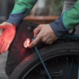 Und selbst des Radlers Kopf – oder besser: sein Helm – eignet sich hervorragend als Reflektor. Signalfarben, Reflektoren und LED-Rücklichter sorgen für bessere Sichtbarkeit im Stadtverkehr. Ein Beispiel ist der „Urban‑I 3.0 Ace“ von Abus (UVP: 149,95 Euro). Der Helm ist bei Dämmerung und Dunkelheit kaum zu übersehen. Die Reflektorstreifen sind so angeordnet, dass sie aus jedem Winkel Scheinwerferlicht reflektieren und dabei grob die Helmsilhouette nachzeichnen. So werden die Träger:innen schnell als Radfahrende erkennbar. „Wenn Radfahrende am Radweg unterwegs sind und die Fahrradbeleuchtung durch parkende Autos verdeckt ist, ist ein leuchtender Helm ein nicht zu unterschätzendes Sicherheitsmerkmal“, so Torsten Mendel von Abus.