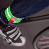 weniger reflektierende Elemente wie bei der Regenjacke „Cyclist“ (UVP: 180 Euro) erhöhen die Sichtbarkeit. Für den speziellen Schutz für den Schulweg werden viele der Produkte auch in Kindergrößen angeboten. Wer es etwas schlichter möchte, greift zu den Reflektorbändern von Fahrer Berlin (UVP: 14 Euro). Die praktischen Hosenbänder werden aus recyceltem Material gefertigt und verfügen über einen reflektierenden Streifen für mehr Sicherheit. Nebeneffekt: Das Hosenbein wird vor der schmutzigen Kette geschützt. Der Berliner Accessoires-Spezialist hat mit den „Reflektor-Button“ (5,95 Euro) eine weitere pfiffige Lösung im Angebot: Die Anstecker werden z. B. an den Jackenärmel geklettet und machen das Armzeichen beim Abbiegen deutlich sichtbarer. Neu im Angebot sind zudem reflektierende Aufkleber in bunten und lustigen Designs (UVP : 9,90 Euro).