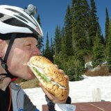 Mich begrüßt der Red Meadow Lake jetzt mit strahlend blauem Himmel. Die Forststraße lässt sich angenehm kurbeln. Doch die Temperatur sinkt mit jedem Meter, den ich klettere. Mir schwant, dass ich wohl doch erstmals durch Schnee stapfen muss. Immer mehr Schneeflecken finden sich unter Bäumen und im Schatten. Nach einer spitzen Kehre ist es soweit. Eine knapp 30 cm hohe Schneeschicht zwingt mich zum Absteigen. Etwa zwei Kilometer weit zerre ich mein Rad durch den Schnee. Der ist bereits sehr pappig, schwer und nass. In wenigen Tagen wird der Pass gänzlich frei sein. Eine Woche nach mir starten knapp 120 Biker gemeinsam beim sogenannten „Great Depart“. Sie werden den Red Meadow barrierefrei bewältigen können. Ich versinke einstweilen mal knietief im Pappschnee, um beim nächsten Schritt auf Eis wegzurutschen. Einige Male verliere ich das Gleichgewicht – und verdrehe mir das rechte Knie. Schließlich wird aus dem Abstieg wieder eine Abfahrt und ich hämmere wie berauscht die Dirtroad hinab Richtung Whitefish. Sie windet sich herrlich den Hang entlang. Immer wieder weite Kurven und kleine Gegenhänge. Die neun Kilo Ausrüstung und mühsam antrainierter Andruck schieben mich hinüber. Eine feine Achterbahnfahrt! Mein Fahrspaß-Appetit ist erst einmal gestillt. Bleibt der echte Hunger – allmählich bekomme ich eine Ahnung, warum der Slogan zur Route „eat, sleep, ride“ lautet.