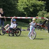 [pd‑f/ht] Ob Kindergeburtstag, Grillausflug oder Sommerfest, ob im Kindergarten oder in der Schule: Fahrradspiele kommen immer gut an – und nicht nur bei den Kleinen, denn Quatsch tut auch Erwachsenen gut. Einzig mit der Sicherheit ist nicht zu spaßen, deswegen bitte nur mit Helm und auf einem geeigneten Gelände abseits des Straßenverkehrs. Perfekt ist eine gemähte Wiese, auf Asphalt dagegen kommt das obligatorische Erste-Hilfe-Set (z. B. Ortlieb „First-Aid-Kit Regular“, 19,95 Euro) wahrscheinlich öfter zum Einsatz. Aber ein paar blaue Flecke gehören dazu.