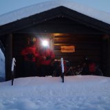 Verrückte Welt: Je näher wir Hjerkinn, dem Dorf auf dem Dovrefjell, kommen, desto wärmer wird es. Im Tal starteten wir bei ‑34 °C. Als wir unsere Räder vor der Wartehalle des Bahnhofs anlehnen, zeigt das Thermometer behagliche ‑17 °C. Nach drei Stunden Anstieg gönnen wir uns eine Mittagspause. Im Wartesaal haben wir reichlich Platz, um unsere Kleidung zum Abtropfen auszulegen und erwärmen die tiefgefrorenen Trockenfrüchte und Schokolade. Der Tee kommt aus den Thermoskannen, die sich bestens bewährt haben. Zwei Stunden später, bei kaum mehr ‑10 °C machen wir uns auf der E6 Richtung Norden auf. Es herrscht ein kräftiger Rückenwind, und wir sausen warm und fröhlich dem Tagesziel in Oppdal entgegen.