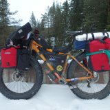 Unterhalb von ‑30 °C ist für Walter und mich völliges Neuland. Bis in die Mittzwanziger-Bereiche hinein haben wir in den letzten Tagen gute Erfahrungen sammeln können. Beispielsweise hat sich die Kombination von 45Nrth-Schuhen („Wölvhammer“) mit wasserdichten Socken und dünnsten Vaude-Radsocken bestens bewährt. Auch die Beinkleider waren kein Problem: eine Regenhose ergänzte einfach die kurze Radhose und dicke Winter-Radhose der letzten Tage. Den Oberkörper hielten ein Merino-Baselayer, ein langes Trikot, eine Isolationsjacke und darüber eine alpine Regenjacke warm. Hier profitierten wir sicher auch von der langjährigen Erfahrung des Bergsport- und Expeditionsausrüsters Vaude. Zu guter Letzt dicke Handschuhe und Pogies für die Hände, Sturmmaske und Helm-Untermütze über den Kopf. Etwas steif waren wir mit den ganzen Schichten schon. Es fühlt sich ein wenig an wie diese „Geronto-Anzüge“, die einem die eingeschränkte Beweglichkeit eines Achtzigjährigen verleihen.