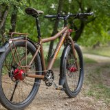 In die gleiche Kerbe, jedoch mit anderem Anspruch schlägt das „Revelstoke“ (Rahmenpreis 2.049 Euro). Das Mountainbike kommt von Van Nicholas, einer niederländischen Firma, die ausschließlich Titanrahmen anbietet. Es rollt auf den „B‑plus“ genannten, drei Zoll breiten 27,5‑Zoll-Mountainbike-Reifen. Das Rad gibt es wahlweise mit Federgabel oder ungefedert. Für die zweite Variante hat die Titanschmiede eine so bisher ungesehene Titangabel mit einseitiger Radaufhängung und zwei voreinander liegenden Gabelholmen präsentiert, ähnlich den „Truss Forks“, wie sie an Cruiser-Rädern in den USA der 1940er üblich waren.