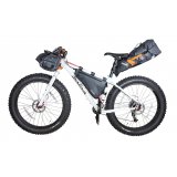 ein Schlagloch mitnimmt oder einen Absatz herunterfährt“, erklärt Kühn. Auch könne das Rad so einfacher auf schmalen Wegen gefahren oder geschoben werden als mit ausladenden breiten Packtaschen auf einem Gepäckträger. Statt eines vorderen Gepäckträgers oder einer Lenkertasche gehört eine Lenkerrolle zum Bikepacking-Setup. Die wird quer zur Fahrtrichtung unter den Lenker geschnürt. Eine Rahmentasche, die das Rahmendreieck möglichst vollständig ausfüllt, hat sich vor allem für schwere Ausrüstungsgegenstände wie Werkzeug und Kocher etabliert. Separate kleine Fächer auf dem Oberrohr, am Lenker und am Unterrohr erweitern das Ladevolumen.