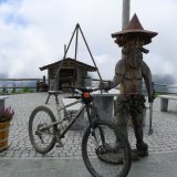 So surfen wir die Trails weiter bis zur Mittelstation am Gotschnaboden, wo sich der Nebel verzieht und wir einige der Biker aus der Bahn wieder treffen. Nach kurzem Austausch fahren wir in strahlendstem Sonnenschein gemeinsam weiter. Hier startet die Freeride-Strecke, ein gebauter Bikepark mit erhöhten Kurven, vielen Northshores und diversen Sprüngen. Mir kommt die Strecke teils etwas eckig vor, aber eine Gruppe Teenies fährt uns um die Ohren, offensichtlich mit jeder Menge Streckenkenntnis und Selbstvertrauen bewährt. Justus setzt sich in den Kopf einen Sprung zu schaffen, ich rolle weiter. Plötzlich muss ich mitten im meditativen Kurvenräubern volle Lotte bremsen. Auf einem Table steht ein Pferd. Mitten im Weg.