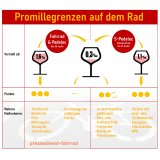 Eine Promillegrenze gibt es auch für Radfahrer:innen. Das absolute Fahrverbot liegt zwar mit 1,6 Promille deutlich über der erlaubten Grenze für Autofahrer:innen mit 0,5. Aber: Wer auffällig fährt oder einen Unfall verursacht, kann bereits ab 0,3 Promille belangt werden. Alkoholisiert Fahrrad fahren ist keine Ordnungswidrigkeit, sondern eine Straftat. Wer mit über 1,6 Promille auf dem Rad erwischt wird, der erhält drei Punkte in Flensburg sowie eine Geldbuße, gestaffelt nach Einkommen. Auch die Anordnung einer Medizinisch-Psychologischen Untersuchung (MPU) sowie ein Führerscheinentzug ist möglich.