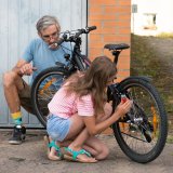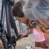 Gemeinsam mit ihrem Papa Kai macht die neunjährige Paula ihr Fahrrad für den Schulstart wieder fit. Eine Anleitung in Bildern vom pressedienst-fahrrad.