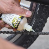 „Wann darf ich endlich fahren?“, fragt Paula ungeduldig und schnappt sich ihren Helm. Sie trägt den „Young‑I“ von Abus (59,90 Euro). „Gleich. Erst noch schnell die Kette ölen“, antwortet Kai und trägt vorsichtig das Schmiermittel „Go!“ von Pedro’s (100 Milliliter für 11,90 Euro) auf. Überflüssiges Öl entfernt er anschließend mit einem Tuch.