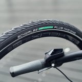 Ohne Reifen rollt nichts und ohne Luft rollen nur wenige Reifen. Ein niedriger Rollwiderstand und damit ein Plus an Kilometerleistung lässt sich mit dem richtigen Luftdruck erzielen. Je nach Fahrergewicht, Beladung, persönlichem Komfortbedarf und Untergrund sollte man den Reifen unterschiedlich aufpumpen. „Passend abgestimmt, bietet der Reifen eine bessere Leistung und somit eine längere Akku-Laufzeit“, fasst René Marks von Schwalbe zusammen. Die Entwicklung von speziellen E‑Bike-Reifen ist ein Schwerpunkt im Unternehmen. Durch das höhere Radgewicht sei ein robuster, breiterer Reifen sinnvoll. Dieser gebe nicht nur mehr Komfort, sondern auch bessere Kontrolle. „Wir setzen zudem mittlerweile auf spezielle Gummimischungen, welche gerade bei höheren Kurvengeschwindigkeiten den E‑Bikes mehr Sicherheit und Grip verleihen“, so Marks.
