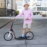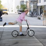 Wigald Boning: „Puky ist ein traditionsreicher Hersteller für Kinderfahrzeuge. Ich war deshalb sehr gespannt, wie sich jetzt ein Modell für Große fährt. Was mich sofort betört, ist die Leichtigkeit des gesamten Geräts. Es sind ja nur wenige Kilo, und man kann den Roller sehr gut tragen und prima in der Bahn mitnehmen.“