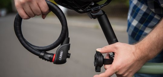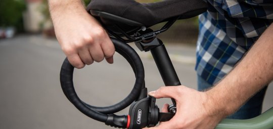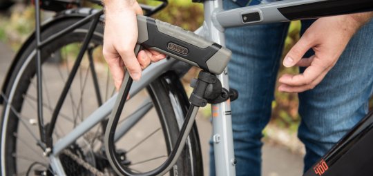 Die Halterung wird einfach an einer Öse am Sattel oder am Gepäckträger befestigt und das spezielle „Phantom 8960“-Kabelschloss von Abus (ab 49,95 Euro) per Magnet eingeklickt.