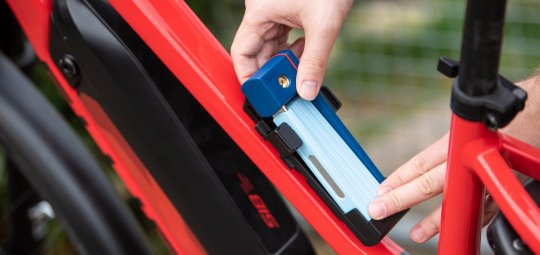 Die Halterung für das kleine Schloss wird einfach per Klettverschluss am Rahmen befestigt. So kann sie schnell entfernt werden, wenn eine Tour ohne Stopp geplant ist. Die Halterung ist nicht im Lieferumfang enthalten und kann optional dazugekauft werden.