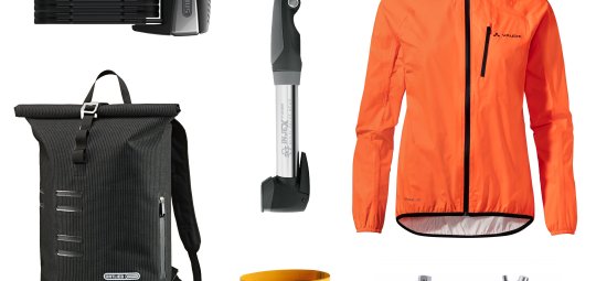 Nicht fehlen sollte im Gepäck eine Regenjacke. Gerade auf dem Heimweg in den Abendstunden ist ein Gewitterschauer im Sommer keine Seltenheit. „Regenjacken für Radfahrer lassen sich klein verpacken und nehmen in der Tasche wenig Platz weg. Dabei sind sie nicht nur bei Regen ein praktischer Helfer – auch in kühlen Morgenstunden eignen sie sich als ein wärmender Überzieher“, weiß Benedikt Tröster vom Outdoor-Spezialisten Vaude. Ebenfalls wichtig im Alltag ist ein Minitool zum Festziehen lockerer Schraubverbindungen. Eine kleine Luftpumpe kann bei einem
