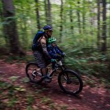 Ich merke allerdings schnell, dass das Fahren zu zweit auf einem E‑Mountainbike doch gewöhnungsbedürftig ist. Zum Glück hat das Haibike ein seitlich am Lenker angebrachtes Display. Ein mittig sitzendes würde ich aufgrund meiner Passagierin nicht ablesen können. Außerdem muss ich deutlich vorausschauender fahren, weil der Vorderreifen und alles, was direkt vor dem Rad passiert, nicht einsehbar sind. Meine anfänglichen Bedenken bezüglich der Sicherheit sind nach wenigen Metern jedoch wie weggeblasen. Das E‑Bike fährt sich auch trotz des Mehrgewichts äußerst stabil. Ich nehme mir allerdings vor, nicht allzu schnell zu fahren und steiles Gelände zu meiden. Sicher ist sicher. Was ich allerdings nicht bedacht habe und was noch viel „schlimmer“ ist: das ständige Geplappere der Mitfahrerin. „Papa, wo fahren wir hin?“, „Papa, warum bist du nicht da lang gefahren?“, „Papa, warum fahren wir hier nicht über die Steine?“ oder „Papa, warum darf ich nicht den Knopf drücken?“