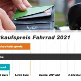 Der durchschnittliche Verkaufspreis liegt laut ZIV bei 1.395 Euro – fast eine Verdreifachung des Wertes von vor zehn Jahren, was natürlich mit dem steigenden Anteil an hochwertigen E‑Bikes zu tun hat. Laut VDZ werden durchschnittlich 3.332 Euro für ein E‑Bike ausgegeben, für ein Fahrrad 654 Euro, wobei die schwierige Verfügbarkeit hochwertiger Sporträdern sich negativ auf den Durchschnittspreis ausgewirkt haben dürfte.