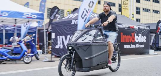 Um den Diebstahl eines Lastenrades zu verhindern, hat Sicherheitsexperte Abus einen speziellen Diebstahlschutz entwickelt. Das Schloss verhindert ein Einklappen des Ständers und dient als eine Art Wegfahrsperre. Das Produkt ist noch ein Prototyp.