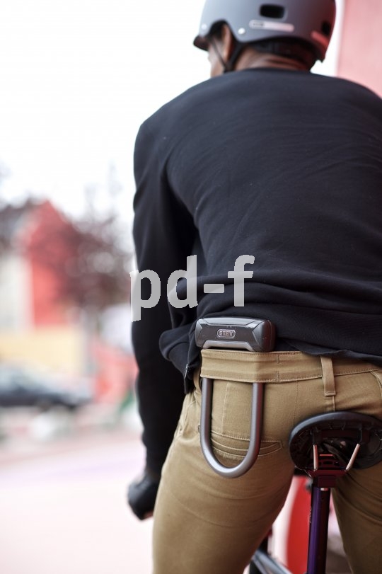 | Bildunterschrift: | Das kompakte Bügelschloss lässt sich auch recht bequem unterm Gürtel transportieren; noch besser ist freilich eine spezielle Radfahrerhose mit Schlosshalterung. |