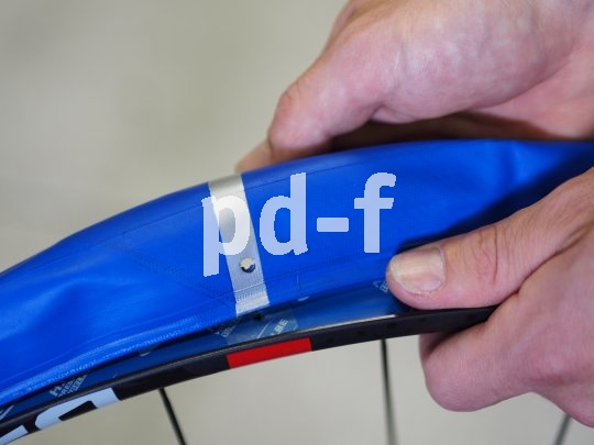 | Bildunterschrift: | Der 4. Schritt: Der blaue Procore-Innenreifen wird mit einer Seite ins Felgenbett gezogen, ganz wie bei der normalen Reifenmontage. Der silberne Streifen wird am Ventilloch positioniert, über das kleine Loch wird später die äußere Kammer aufgepumpt. |