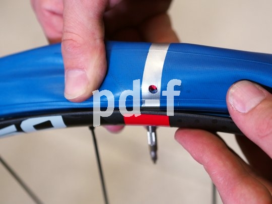 | Bildunterschrift: | Als siebtes wird die zweite Seite des Innenreifens über das Felgenhorn gezogen. Durch das Loch im silbernen Streifen muss der rote Airguide zu sehen sein. |