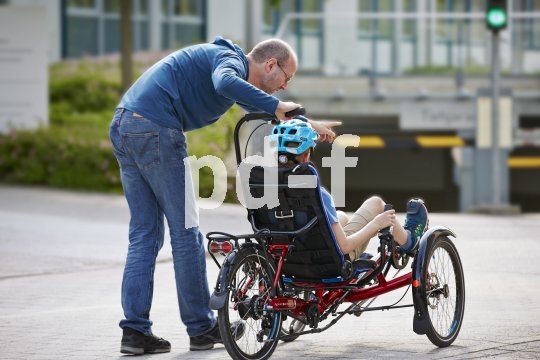 | Bildunterschrift: | Ein Zusatzgriff ermöglicht es Begleitpersonen, Menschen mit Handicap beim Fahren auf dem Trike zu unterstützen. |