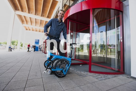 | Bildunterschrift: | Nur wenige Handgriffe sind nötig, um aus dem vollgefederten Faltrad ein kompaktes Paket zu machen, das auch im Büro ein Plätzchen findet. |