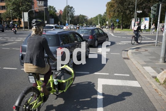 | Bildunterschrift: | Gerade beim Abbiegen kommt es immer wieder zu Konflikten zwischen Radfahrern und Autofahrern. |