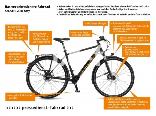 | Bildunterschrift: | Das verkehrssichere Fahrrad laut neuem Paragraph 67 der StVZO (gültig seit Juni 2017). |