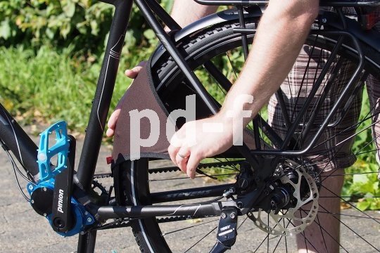 | Bildunterschrift: | Mit zwei Handgriffen ist der Spritzschutz "Buxe" am Hinterrad montiert und verhindert nasse Hosenbeine. |