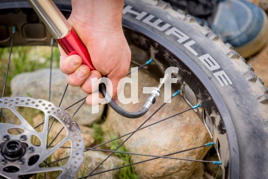 | Bildunterschrift: | Mit einer Handpumpe kann nach einem Defekt unterwegs der Reifen schnell wieder aufgepumpt werden. |