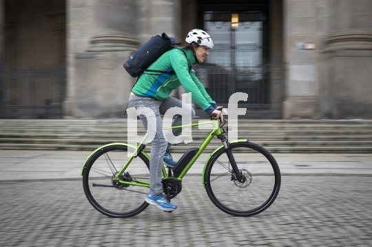 Bildunterschrift: Modernes Radpendeln mit modischem E-Bike und wasserdichtem Rucksack.