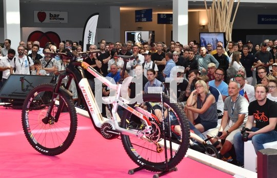 | Bildunterschrift: | Die Präsentation der Neuheiten während der Eurobike zieht viele Fachbesucher in ihren Bann - wie hier die Weltpremiere von Haibikes neuem E-MTB-Konzept "Flyon". |
