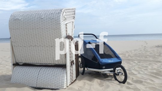 Bildunterschrift: Dank Joggerrad lässt sich ein Kinderanhänger auch an den Strand mitnehmen.