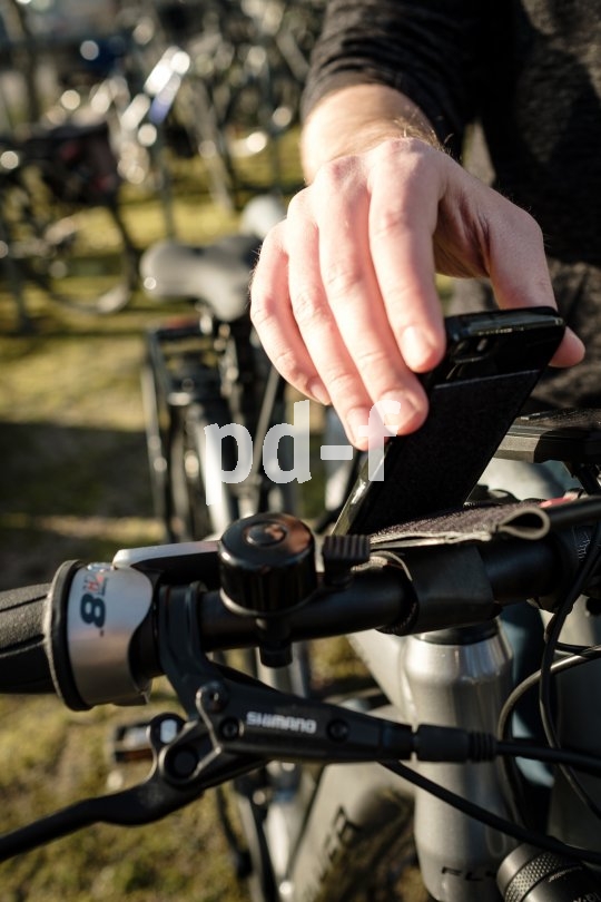 | Bildunterschrift: | Ein großflächiger Klett an der Handyhalterung "Spitzel" von Fahrer Berlin hält das Smartphone auch auf ruppigen Pisten sicher am Lenker. Handyhülle und universelle Lenkerhalterung sind auch einzeln erhältlich. |
