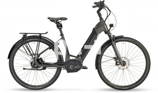 | Bildunterschrift: | So kann ein E-Stadtrad aussehen: tiefer Durchstieg, Gepäckträger, Scheibenbremsen. An diesem Pedelec der Firma Stevens ist alles dran. |