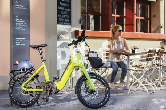 | Bildunterschrift: | Kompakte Elektrobikes bieten alles, was der Nutzer in der Stadt braucht: genug Power, gute Bremsen, maßvolles Gewicht, wenig Platzbedarf beim Abstellen. Dieses Modell der Firma Flyer nutzt einen wartungsfreien, sauberen Riemen für den Antrieb. |