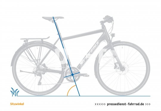 | Bildunterschrift: | Der Sitzwinkel ist ein Wert aus dem Sitzdreieck, angegeben wird der Winkel der Sitzhöhe zur Horizontalen. Je flacher der Sitzwinkel, desto weiter hinter dem Tretlager sitzt der Radfahrer und desto mehr Gewicht verteilt sich auf das Hinterrad. Flache Sitzwinkel finden sich an Hollandrad und Cruiser. Je steiler der Winkel, desto weiter befindet sich der Sattel über dem Tretlager, desto mehr Körpergewicht setzt man zum Pedalieren ein. Man findet den steilen Winkel an Zeitfahrrädern und moderner MTB-Geometrie, wo er die mittige Position auf dem Rad begünstigt und Traktion beim Klettern liefert. |
