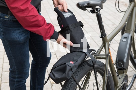 | Bildunterschrift: | Die "Battery Bag" von Fahrer Berlin ist als wasserdichte, polsternde One-size-fits-all-Hülle für den häufig mitgeführten Zweitakku konzipiert. Sie kann auf dem Gepäckträger wie auch am Rahmen befestigt werden. |