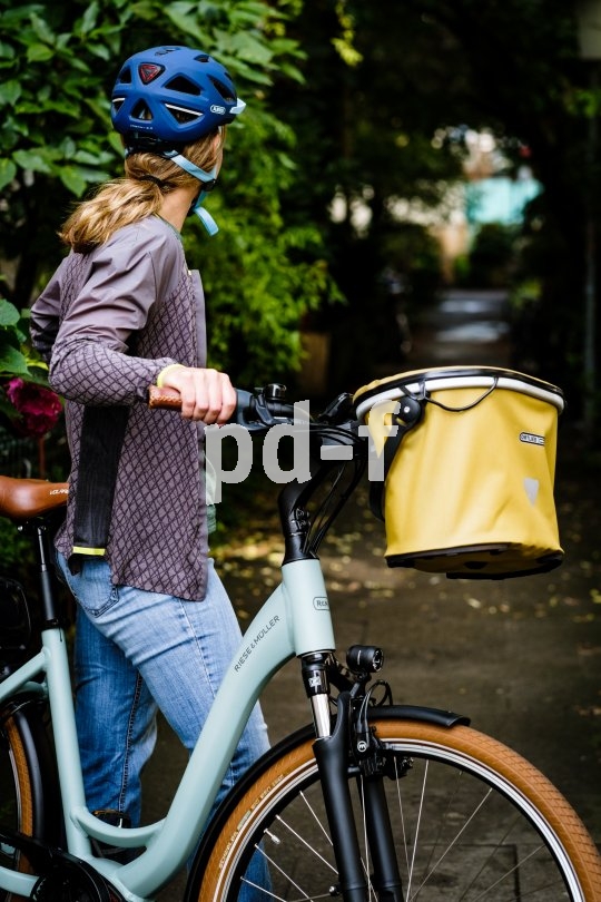 | Bildunterschrift: | Schick, sicher, praktisch: ein Rad mit tiefem Durchstieg und ein guter Helm, dazu ein Fahrradkorb mit wasserdichtem Textildeckel und -bezug zur Lenkermontage. |