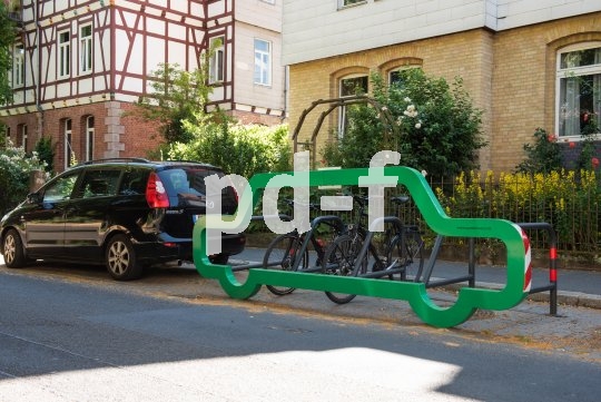 | Bildunterschrift: | Fünf Bügel zum Anschließen von Fahrrädern auf dem Parkraum eines Mittelklasse-Autos bietet diese stabile Abstellanlage. |