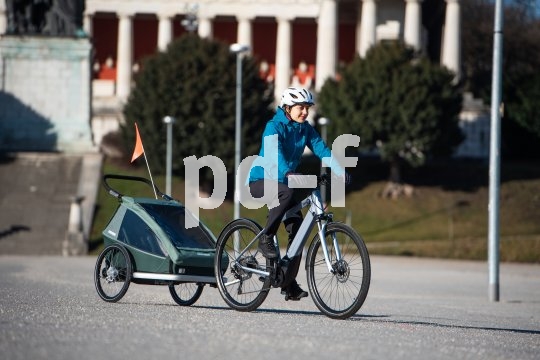 | Bildunterschrift: | Auch ein sehr sportlich ausgelegtes Fahrrad kann Transportdienstleister sein: Anhänger machen es möglich. Dieser lässt sich zudem als Jogger nutzen. |