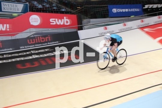 | Bildunterschrift: | Farbige Linien geben den Bahnsportlern auch bei hohen Geschwindigkeiten eine gute Orientierung auf der Bahn. Das ist auch deshalb wichtig, weil hier ohne Bremsen gefahren wird. Fahrer sollten also immer ein Gefühl für die eigene Fahrlinie und die der anderen Rennteilnehmer haben. |