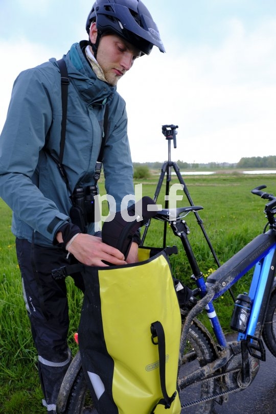 Bildunterschrift: Das Spektiv reist wettergschützt in der Ortlieb-Tasche