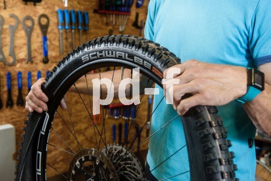 | Bildunterschrift: | Jetzt wird die zweite Reifenwulst ins Felgenbett gehoben. Am einfachsten geht das, wenn sich beide Reifenwülste in der vertieften Mitte des Felgenbetts treffen. |