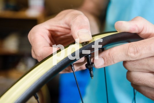 | Bildunterschrift: | Mit dem Tubeless-Ventil wird das Felgenband am Ventilloch vorsichtig durchstochen. Einer Rändelmutter mit Dichtungsring sorgt für den sicheren und luftdichten Sitz des Ventils. |