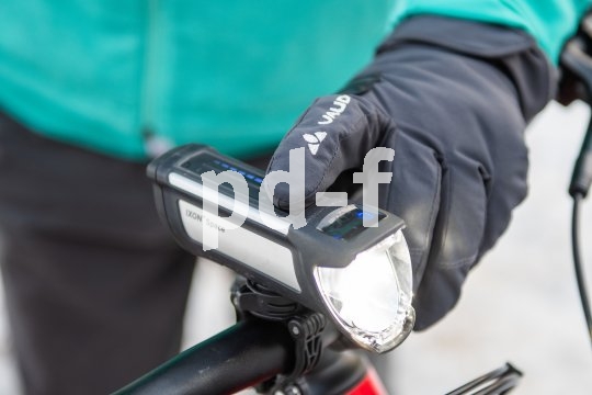 | Bildunterschrift: | Wichtig im Winter: Fahrradzubehör wie hier die Akkubeleuchtung muss auch mit warmen Handschuhen bedienbar bleiben. |