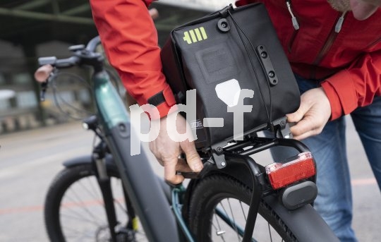 | Bildunterschrift: | Praktisch für den Pendler: Tasche mit Klicksystem, das gleichzeitig als Fuß dient. So fällt sie während der Fahrt nicht ab und unter dem Schreibtisch nicht um. |