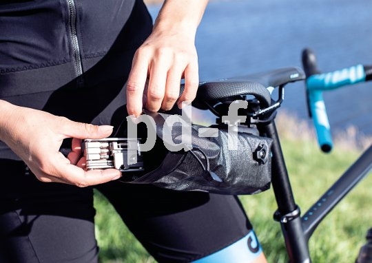 | Bildunterschrift: | Ersatzschlauch, Multitool, Riegel und Schlüsselbund - alles passt in die kleine tasche unter dem Sattel. Und drückt damit nicht in der Trikottasche. |