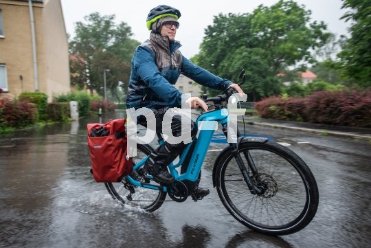 | Bildunterschrift: | Dem Fahrrad macht es wenig aus, aber der Mensch muss sich schon ein bisschen darauf einrichten: Regenwetter. Lösungen für Bekleidung und Gepäck gibt es in Hülle und Fülle. |